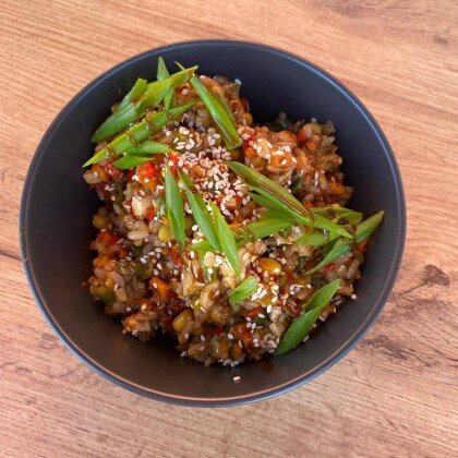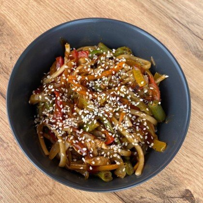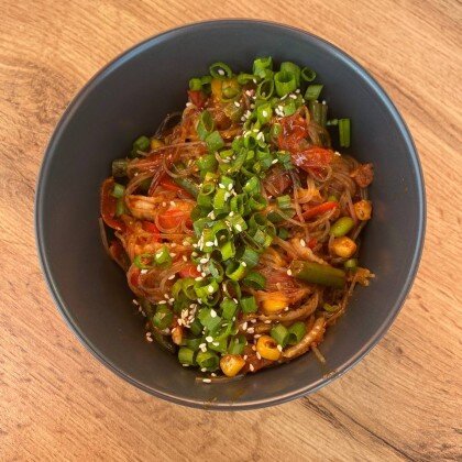 Лапша пшеничная, чеснок, капуста пекинская, фасоль стручковая, соус чили, сладкая кукуруза, соус соевый, кунжут, болгарский перец, креветки, кинза, филе куриное