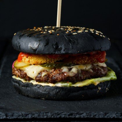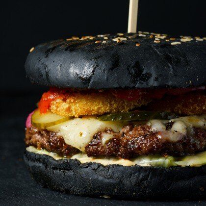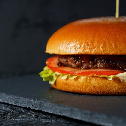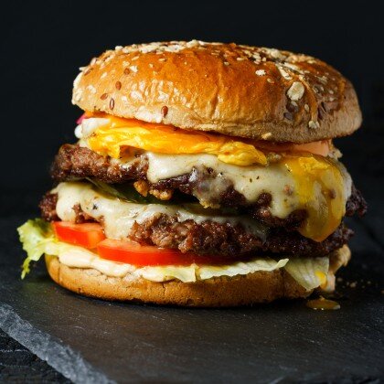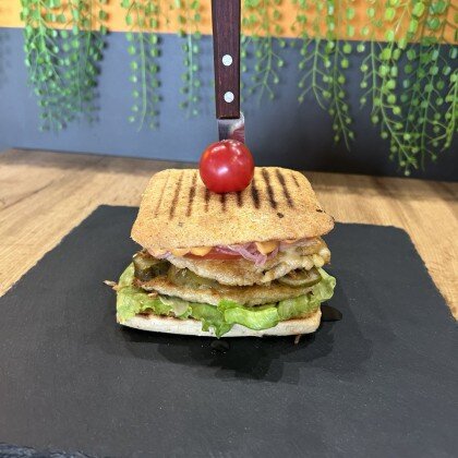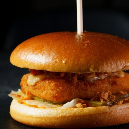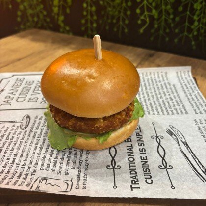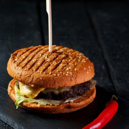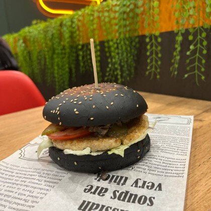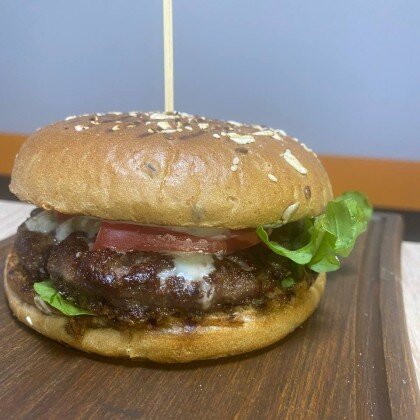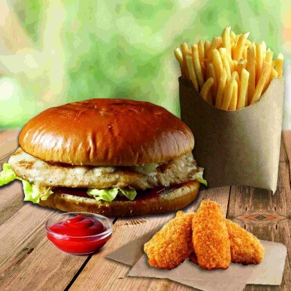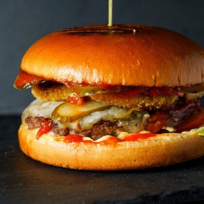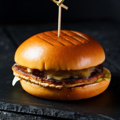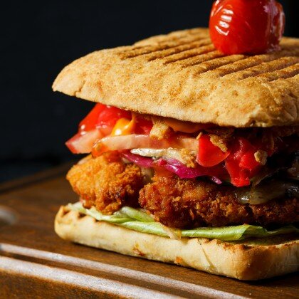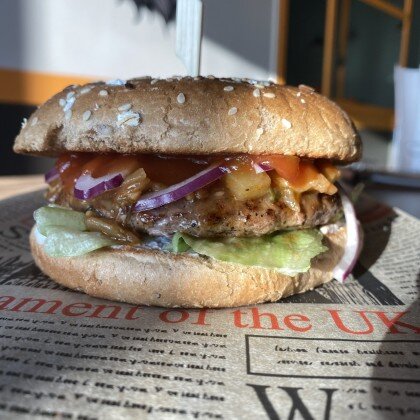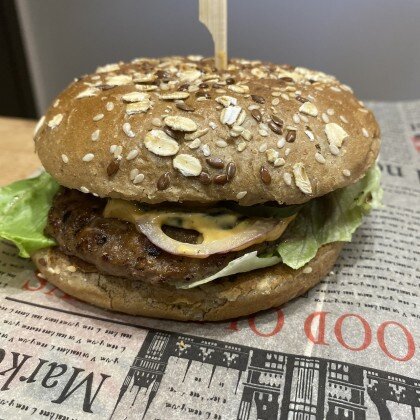 Булочка на сливочном масле, котлета куриная, 2 фирменных соус от шефа, сыр Чеддер, салат Айсберг, маринованные огурчики, карамелизованный лук, грибы шампиньоны