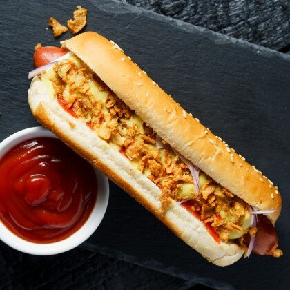 Булочка Фрэнч дог, сосиска говяжья, соус от шефа