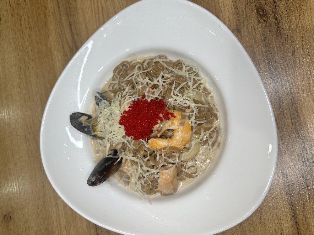 Соба/удон, кальмар, мидии, королевские креветки, лосось, сливки , икра масага, сыр пармезан, томатв черри.