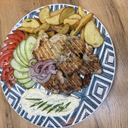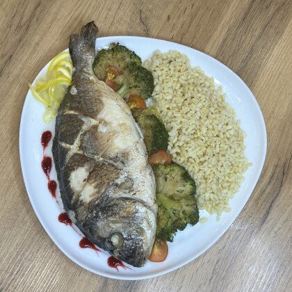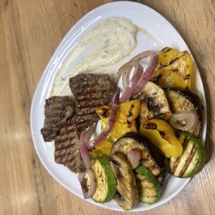 Лосось, Специи, Лимон, Чесночный соус-тузлук, Кускус, Брокколи.
