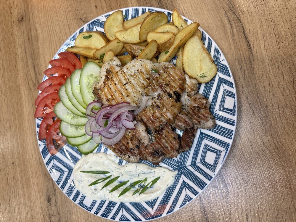 Бедро куриное, Картофель по деревенски, Специи, Укроп, Соус от шефа, Красный лук, Помидоры, Огурецы, Оливковое масло.