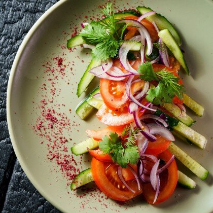 Салат айсберг, руккола, соус цезарь, креветки, помидор черри, сухарики