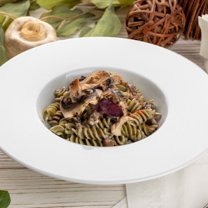 Чёрная паста неро с нежным лососем, тигровыми креветками, кальмарами, сливками, сладкими томатами черри и сыром пармезан