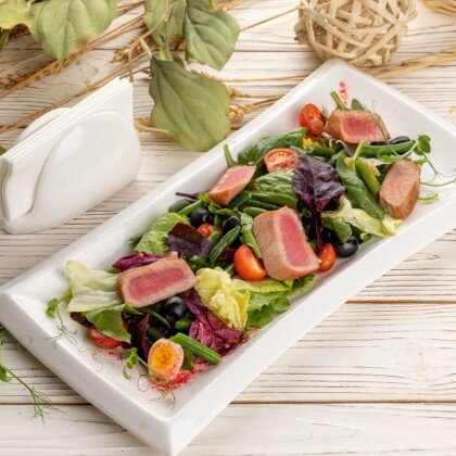 Куриное филе на гриле и салат романо, заправленный фирменным соусом цезарь, подаётся с гренками из хлеба чиабатта, перепелиным яйцом, томатами черри и сыром пармезан