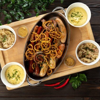 Ассорти из колбас: берлинской, тирольской, баварской и пряной с сыром - подаётся с картофельным пюре с беконом, ароматной тушеной капустой, салатом из свежих овощей и дижонской горчицей