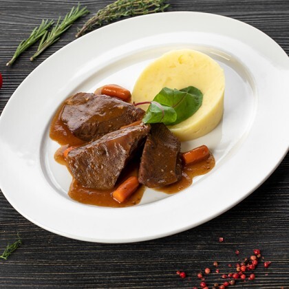 Пельмени с фирменным фаршем из свинины, говядины, лука и зелени, подаются со сметаной (200/30 гр.) Б - 7,5, Ж - 15, У - 23 ккал: 260 АЛЛЕРГЕНЫ: глютен, яйцо, молочные продукты