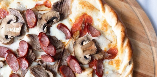 Тесто, соус, ветчина, сыр «Россия», сыр «Дор блю», салями, кунжут, помидор