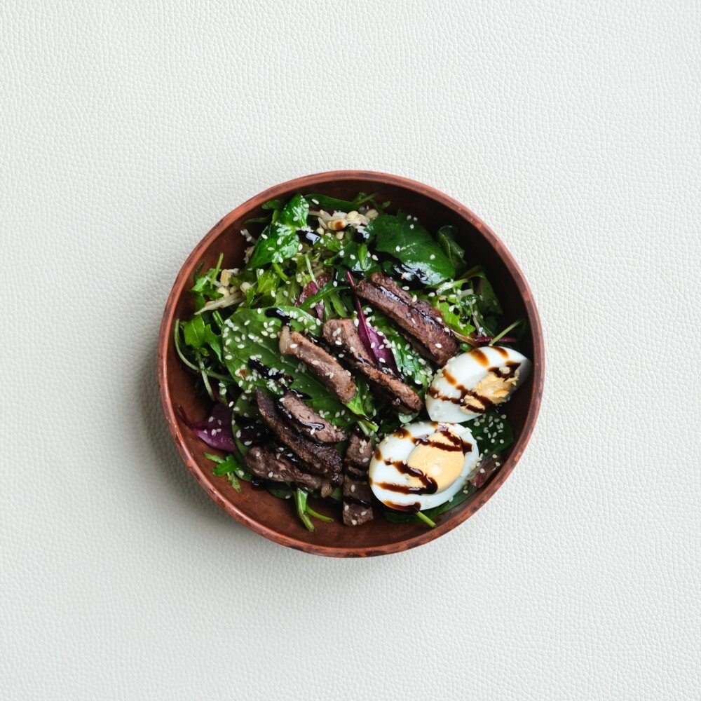 телятина, щавель, помидоры Черри, яйцо, курица, соевый соус