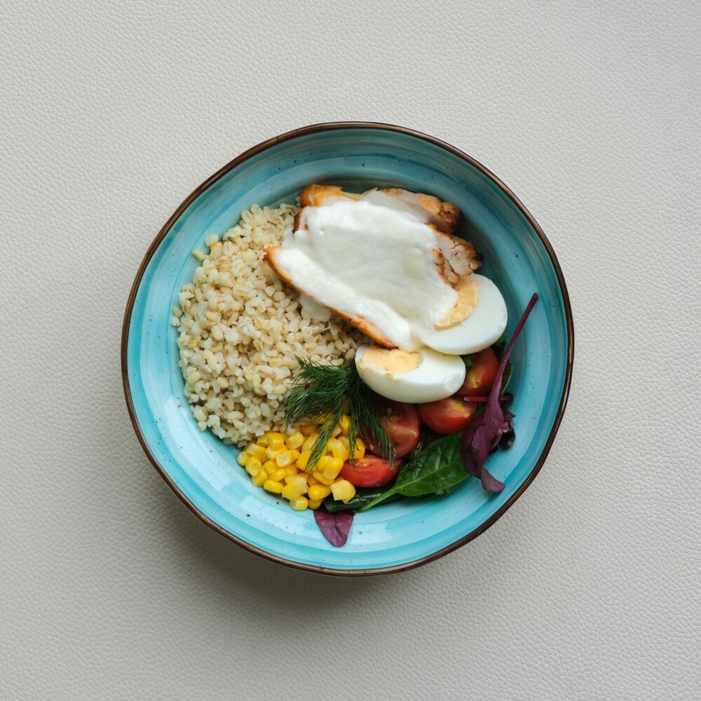 курица, булгур/рис, кукуруза, микс зелени, черри, яйцо