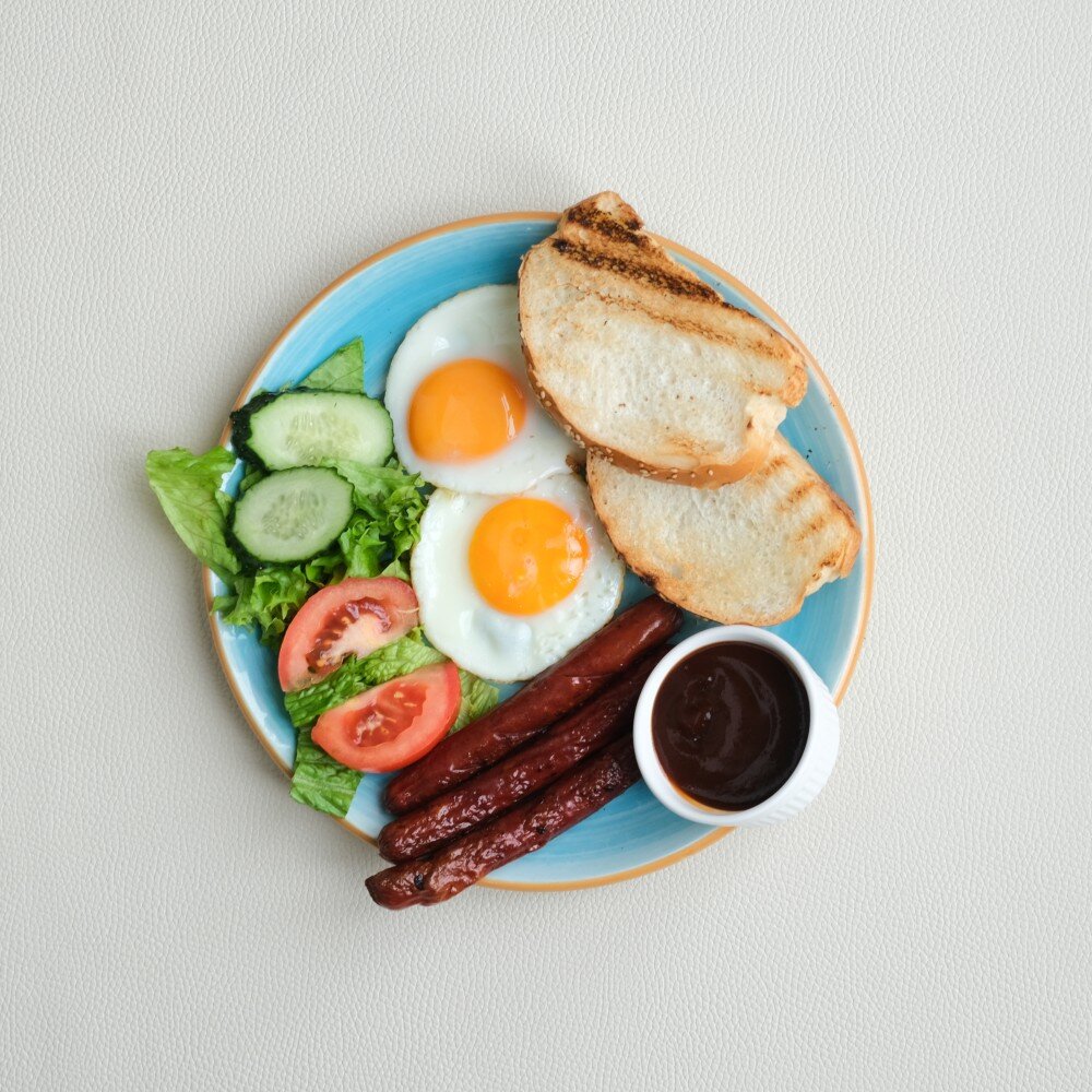 яичница, тосты, сосиски Хицунов, соус барбекью