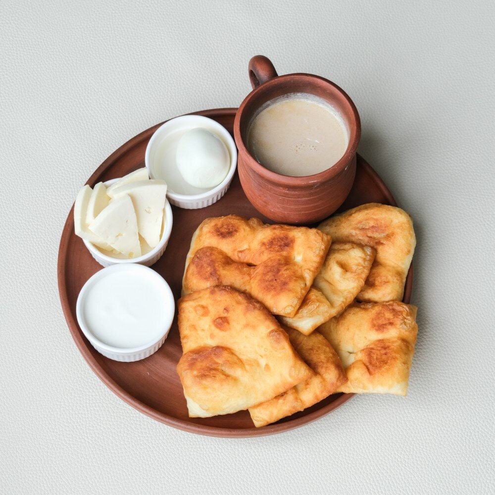 cыр, пышки, калмыцкий чай, яйцо