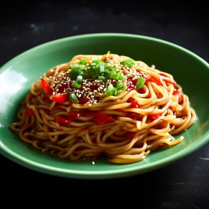 Жареная говядина с овощами в ароматном соусе: сочные кусочки мяса, тушёные с луком, перцем и морковью. Блюдо приправлено кунжутным и растительным маслом, соевым соусом, паприкой и сахаром, посыпано кунжутом и свежей петрушкой.